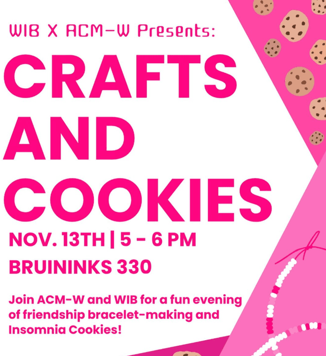 WiB x ACM-W are teaming up for a bracelet-making night with Insomnia Cookies. Friendship bracelets, bead bracelets, rubber band bracelets - all supplies provided!